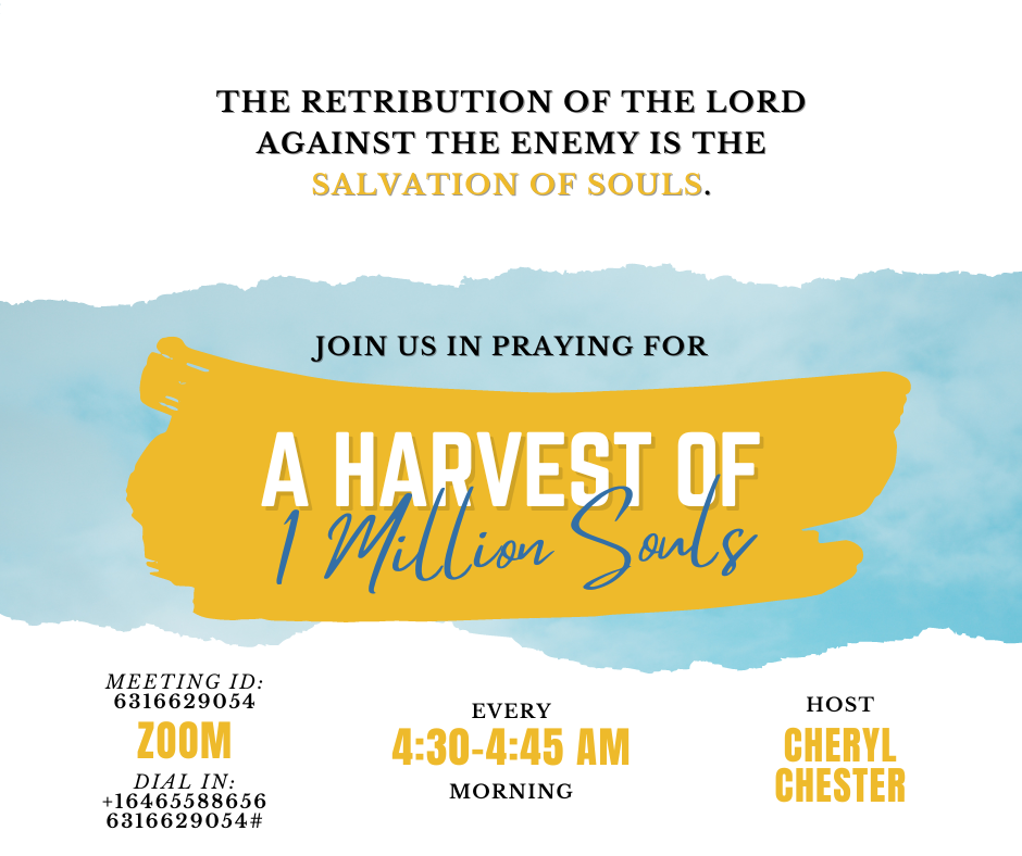 Join us on Zoom, every morning from 4:30-4:45 AM, as we pray for the harvest of a million souls.